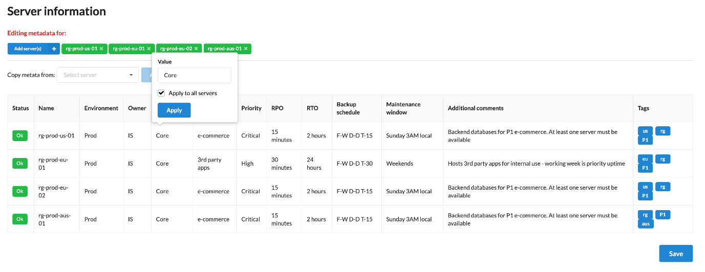 It can be easy to lose track of important metadata like the purpose, owner or backup schedule of a server, for example, and it’s important to be able to search and filter your servers in a way that makes sense to you (whether that be by environment, product, region or anything else).
