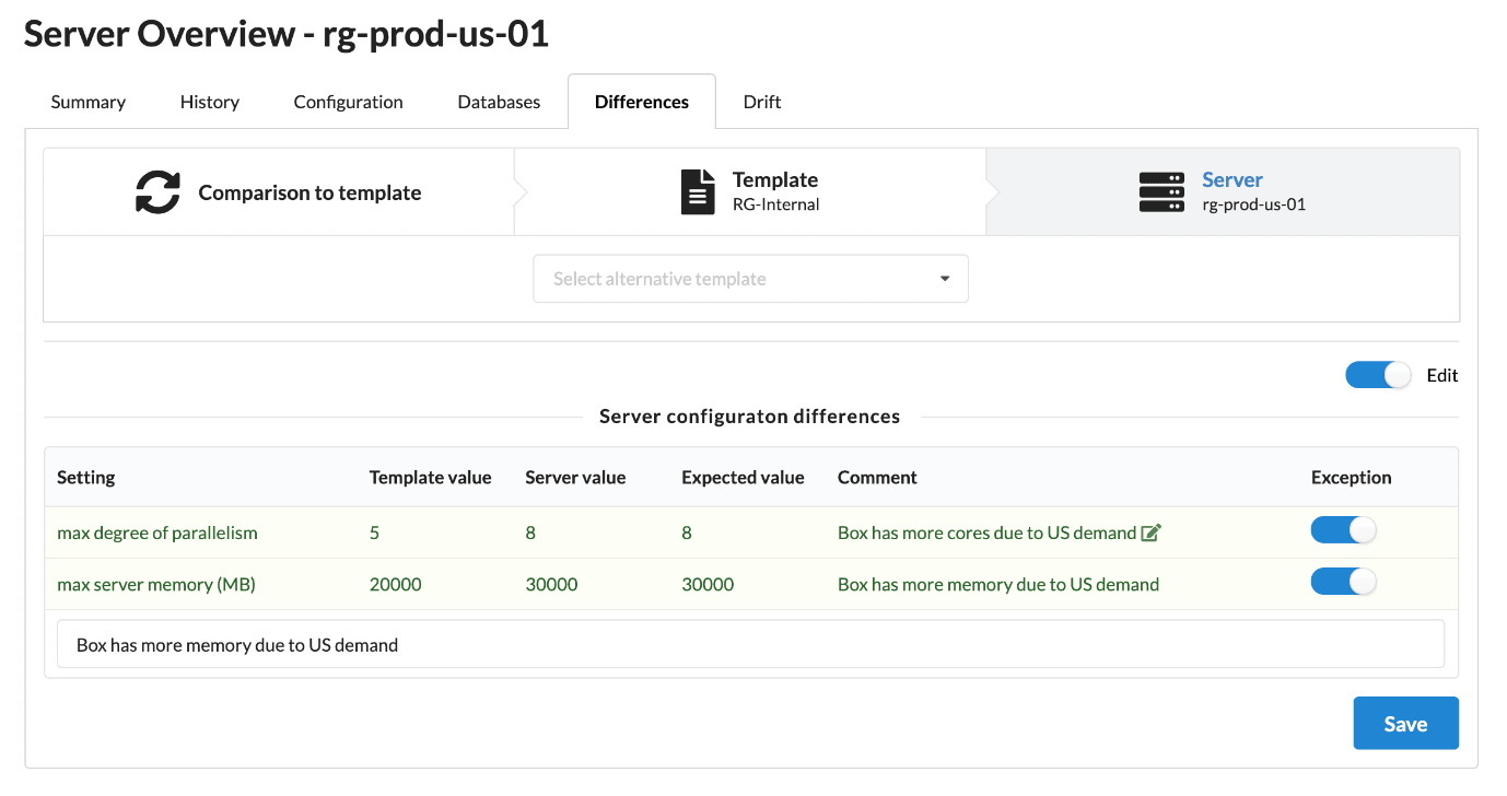 To address this, Estate Management keeps a history of your server configuration and lets you assign templates to servers to specify the intended settings. Where there are intentional differences from the template, you can approve these with a reason to explain why: