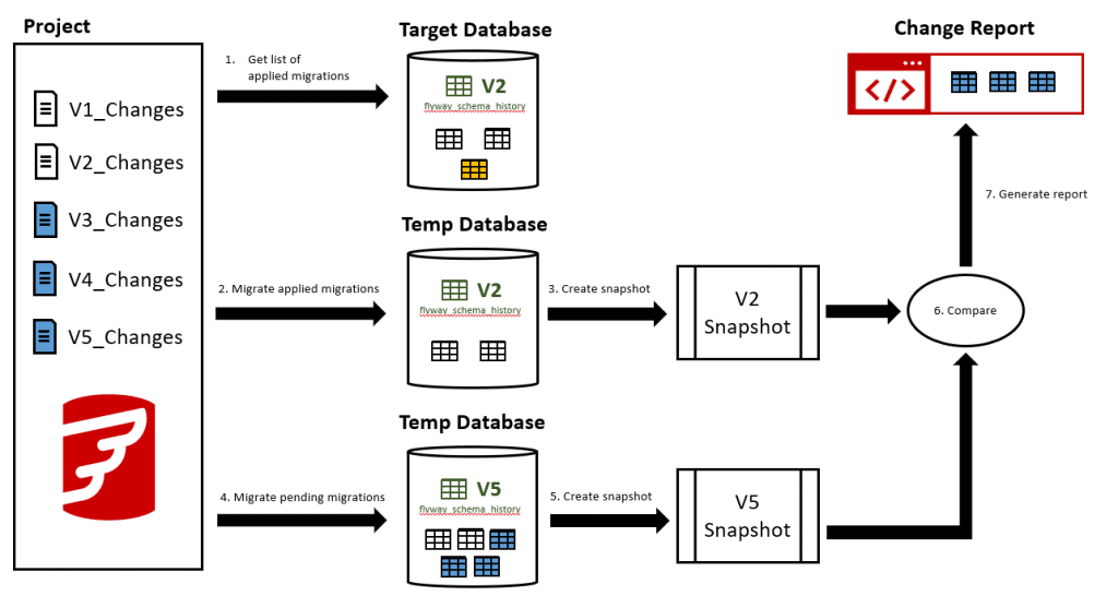 Given a project with some pending migrations, these are the steps Flyway performs to generate a Change Report: