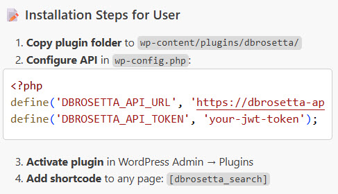 Context You are an expert WordPress plugin developer. Implement a minimal, secure plugin that allows a WordPress site to query the dbRosetta API (hosted in Azure) and display results. The plugin must: – Provide a search form where users can enter a term and select a database. – Send the query securely to the dbRosetta API (using HTTPS and JWT/OAuth tokens). – Display multiple terms and explanations returned by the API. – Prevent SQL injection and insecure input handling by validating and sanitizing all user input before sending to the API. – Be simple: no admin UI or data entry at this stage.
