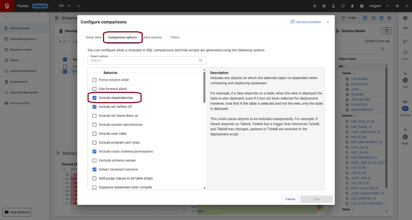 By default, Flyway has always included dependencies for Oracle and SQL Server projects. For SQL Server projects, there is a comparison option to turn this off. We now have the same option for Oracle projects as well. You can see this and all the comparison options by clicking “Configure comparison” on the Schema model page:
