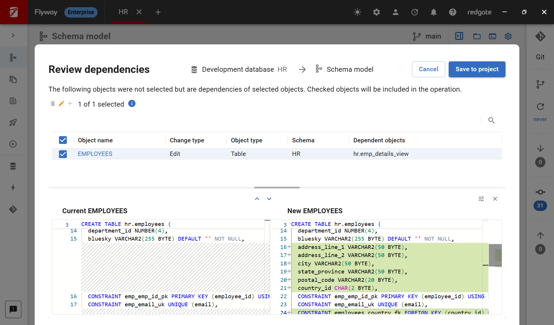 If I only select EMP_DETAILS_VIEW and click Save, Flyway now warns me that this view depends on the altered EMPLOYEES table. I can see how that table has changed in the diff viewer at the bottom of the Review dependencies pop up as well.