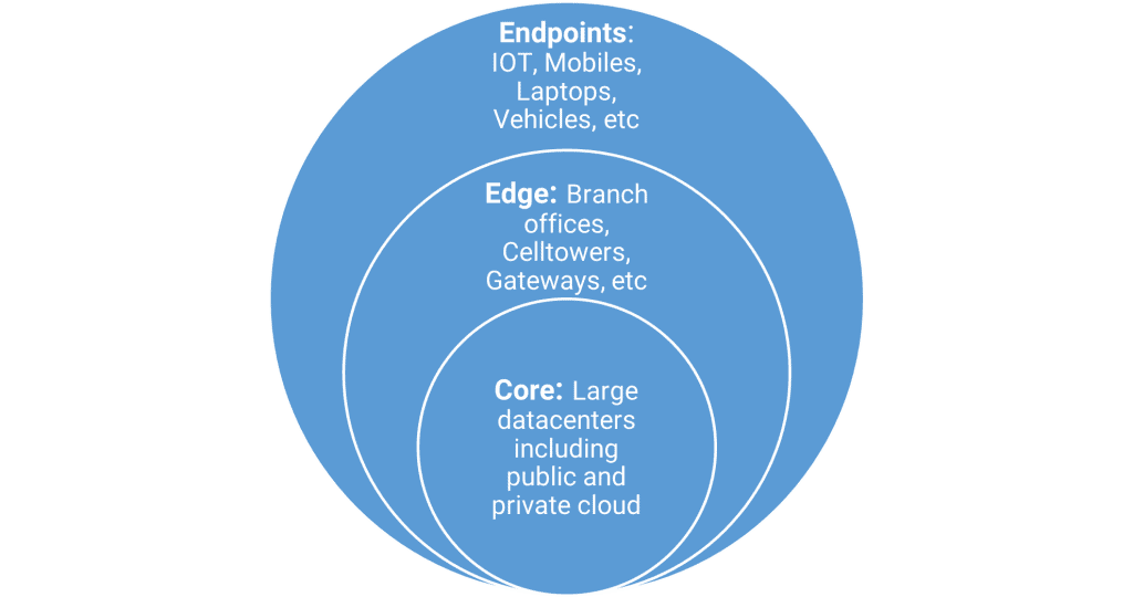 At the Endpoints are devices that sit outside the networks like mobiles, sensors, and IoT devices such as wearables. At the Edge are enterprise-hardened servers in locations like regional offices, and smaller datacenters located to maintain response times or meet local data privacy requirements. At the Core are enterprise and cloud provider datacenters where most of the processing and analytics work goes on.