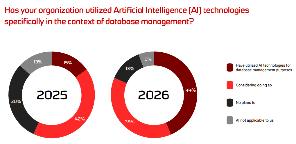 AI adoption in database work has jumped 15% to 44% in a year. AI helps people move faster, drafting changes, automating scripts, optimizing queries and doing more work with fewer specialists.