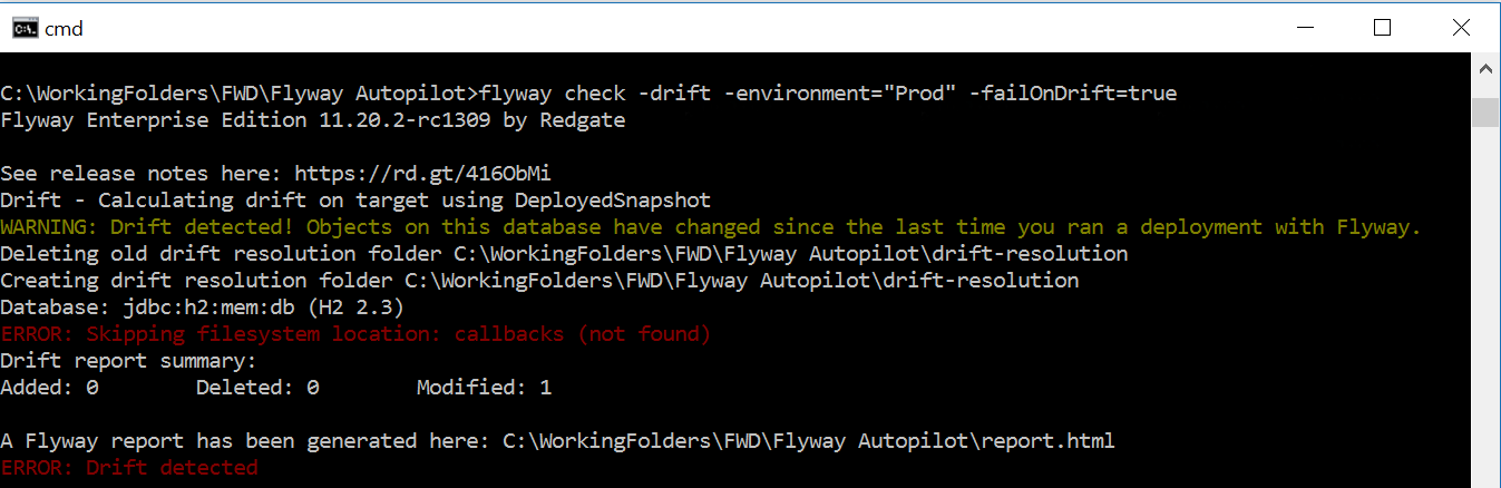 When Flyway runs a drift check either manually or as part of your pipeline, it: