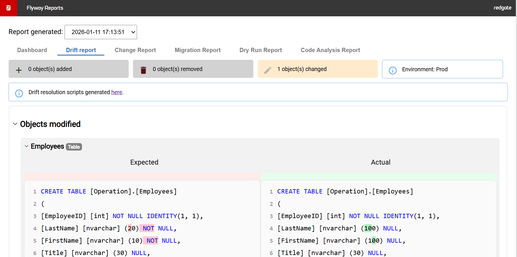 - Give you a report with the number of objects that have drifted and allow you to drill into these objects to see a side-by-side diff between what was expected and what is actually in the target database.