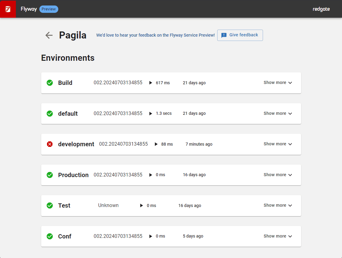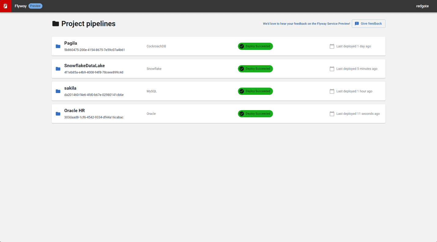 Flyway Pipelines will allow you to see at an elevated level your database deployments across projects. It will mean that end users and team leads have the same, consistent information at their fingertips to be able to view who deployed what, when and where. With a history of database deployments in one place, we have removed the challenge teams currently face when they have to connect to multiple environments just to see the latest state of their databases. We believe this will be especially helpful for locked down environments.