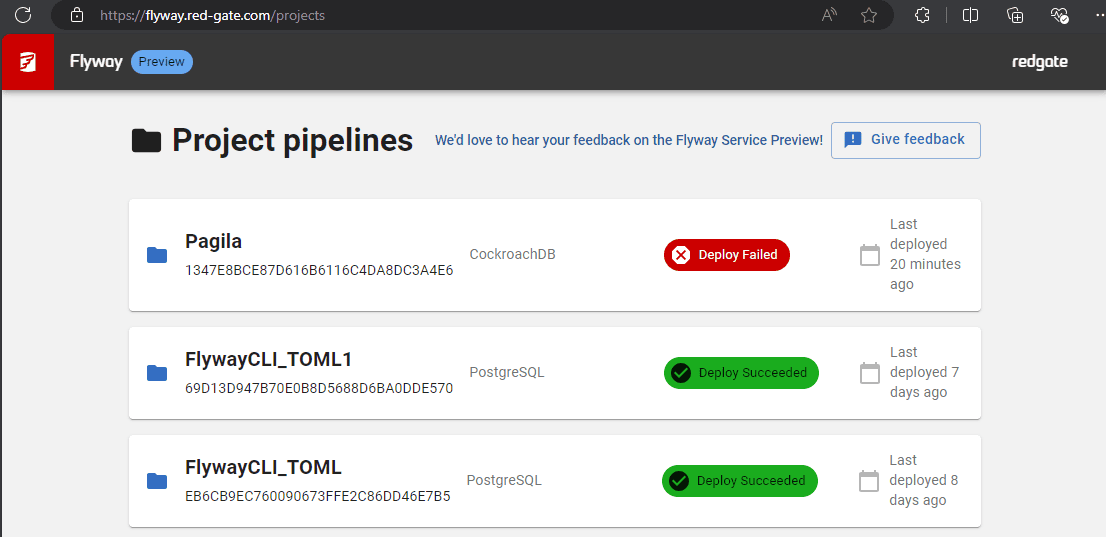 We are excited to share our preview release of the Flyway Pipelines with you, and we would love to hear your thoughts as you get started. Please download the latest version of Flyway then access Flyway Pipelines https://flyway.red-gate.com for more information on how to get started. We’re ready to share your feedback with us, please email me adam.britt@red-gate.com. The engineering team would love to hear about your ideas and how Flyway Pipelines can support your deployment processes.