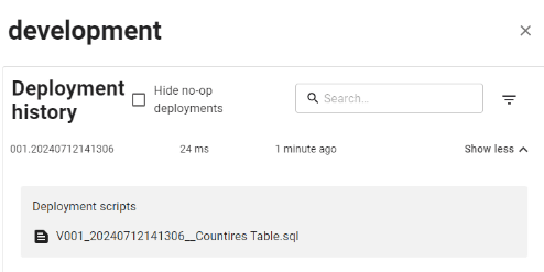 By clicking on Show more, you can see a detailed deployment history for each environment. In the screenshot below, you can see that the detailed deployment history includes information such as how long the deployment took to complete, when it happened, and the script(s) that were deployed.