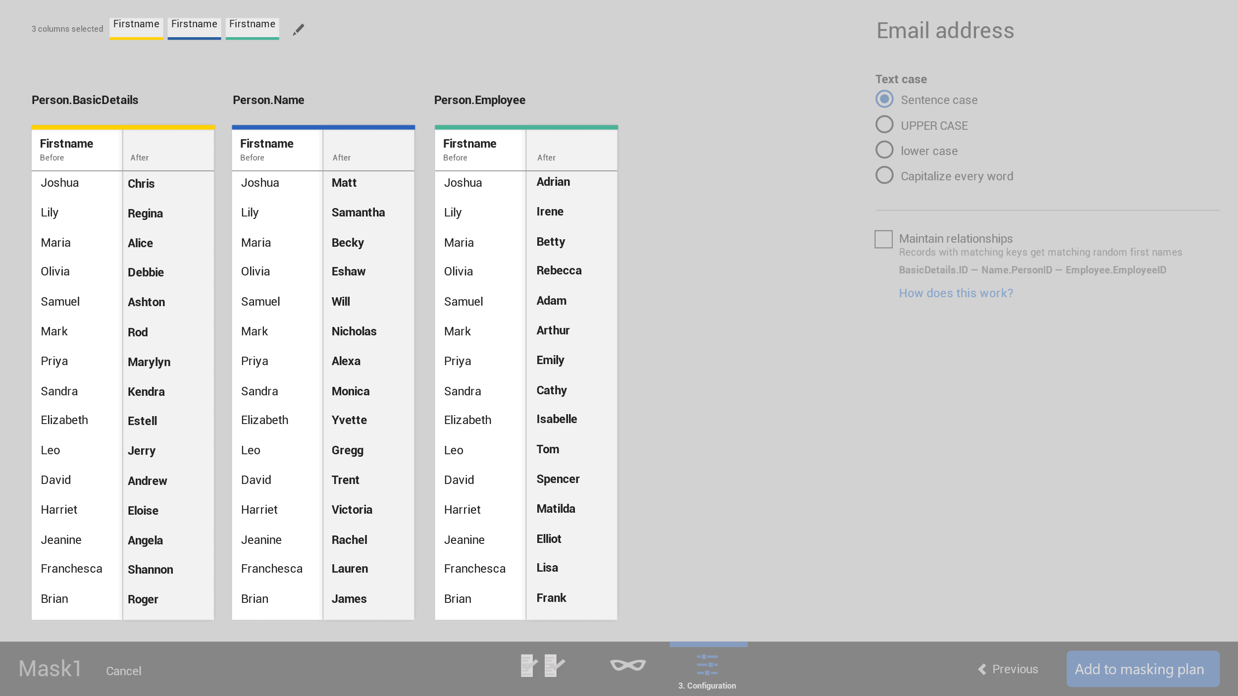 We want to do the hard work for you. Consider this scenario: you have two first name columns in two tables, and they have a PK-FK relationship via an ID column. You want to mask both columns in such a way that the relationship stays intact. With V-Next, you can simply check a box and the software will then figure out how to do the rest.