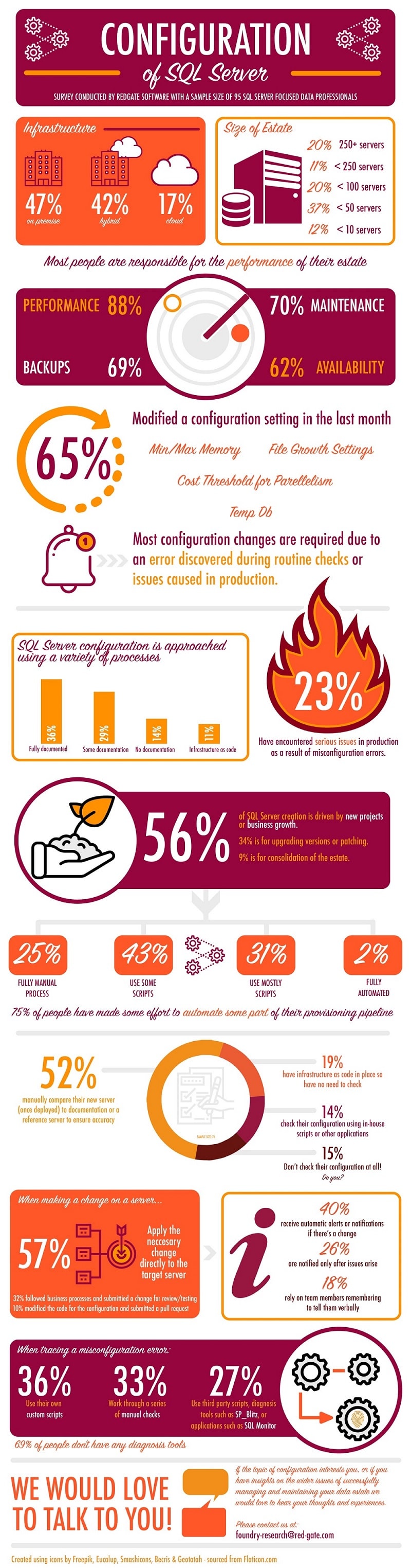 As the infographic mentions at the bottom, developing and deepening our understanding is an ongoing exercise. Therefore, if you have any thoughts, experiences or challenges regarding SQL Server configuration, or especially the wider scope of the complexity of managing your entire environments, we’d love to hear from you and arrange a research conversation to hear about them.