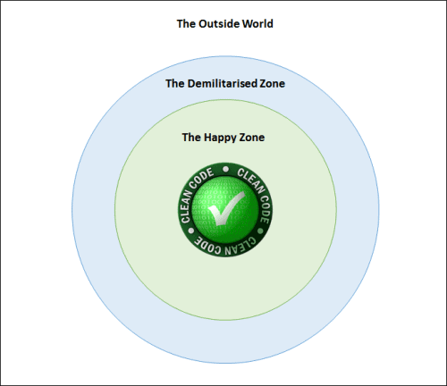 - Code should flow from the Demilitarized Zone into the Happy Zone The Demilitarized Zone should not attract logic. All the logic should flow into the Happy Zone. The Demilitarized Zone contains the minimum amount of code required to invoke the external libraries; everything else can run in memory and should live in the Happy Zone.