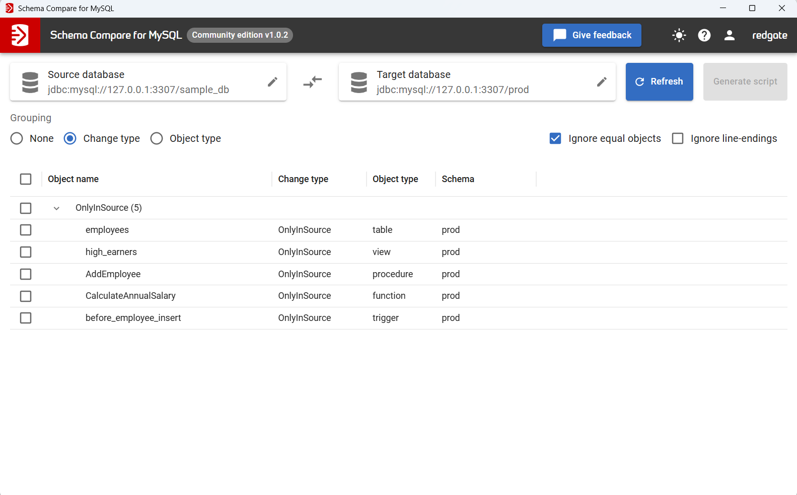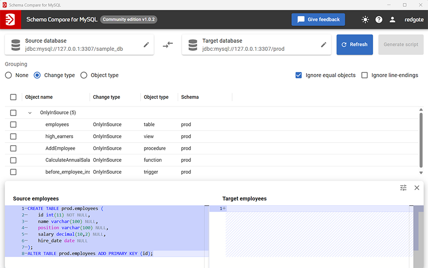 Vergleichen Sie MySQL-Schemata objektgenau und erkennen Sie Unterschiede bei Tabellen, Views, Triggern, Routinen und mehr.