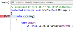If you have the assembly's .pdb file, you can even view line-level timings for the decompiled code, letting you identify the exact line that caused the bottleneck. The heat map alongside the vertical scroll bar helps you jump directly to the lines of code that account for the greatest execution time: