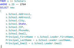 SELECT 1 AS [C1], [Extent2].[Address1] AS [Address1], [Extent2].[Address2] AS [Address2], [Extent2].[City] AS [City], [Extent2].[State] AS [State], [Extent2].[ZIP] AS [ZIP], [Extent2].[PhoneNo] AS [PhoneNo], [Extent2].[Email] AS [Email], [Join2].[FirstName] AS [FirstName], [Join2].[LastName] AS [LastName], [Join2].[Email] AS [Email1] FROM [dbo].[Scholar] AS [Extent1] LEFT OUTER JOIN [dbo].[School] AS [Extent2] ON [Extent1]. [SchoolID] = [Extent2].[ID] LEFT OUTER JOIN (SELECT [Extent3].[ID] AS [ID1], [Extent4].[FirstName] AS [FirstName], [Extent4]. [LastName] AS [LastName], [Extent4].[Email] AS [Email] FROM [dbo].[Staff] AS [Extent3] INNER JOIN [dbo].[Person] AS [Extent4] ON [Extent3]. [ID] = [Extent4].[ID] ) AS [Join2] ON [Extent2]. [LeaderStaffID] = [Join2].[ID1] WHERE 2764 = [Extent1].[ID]