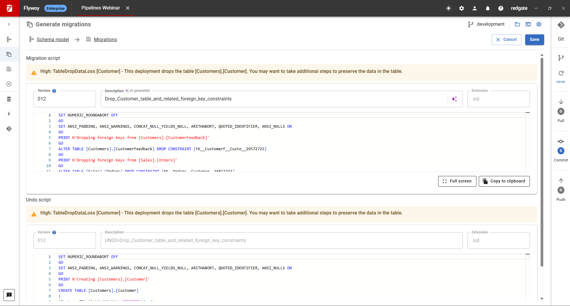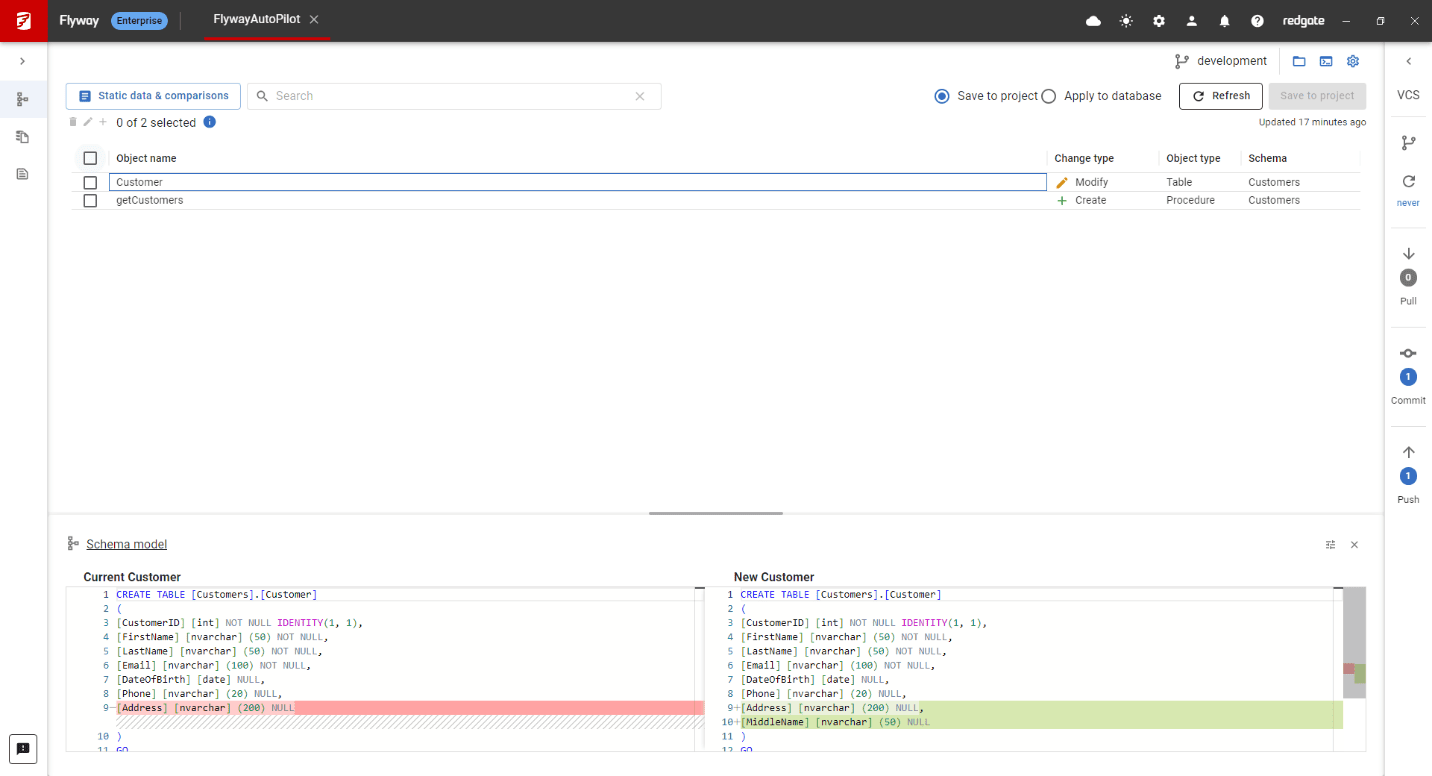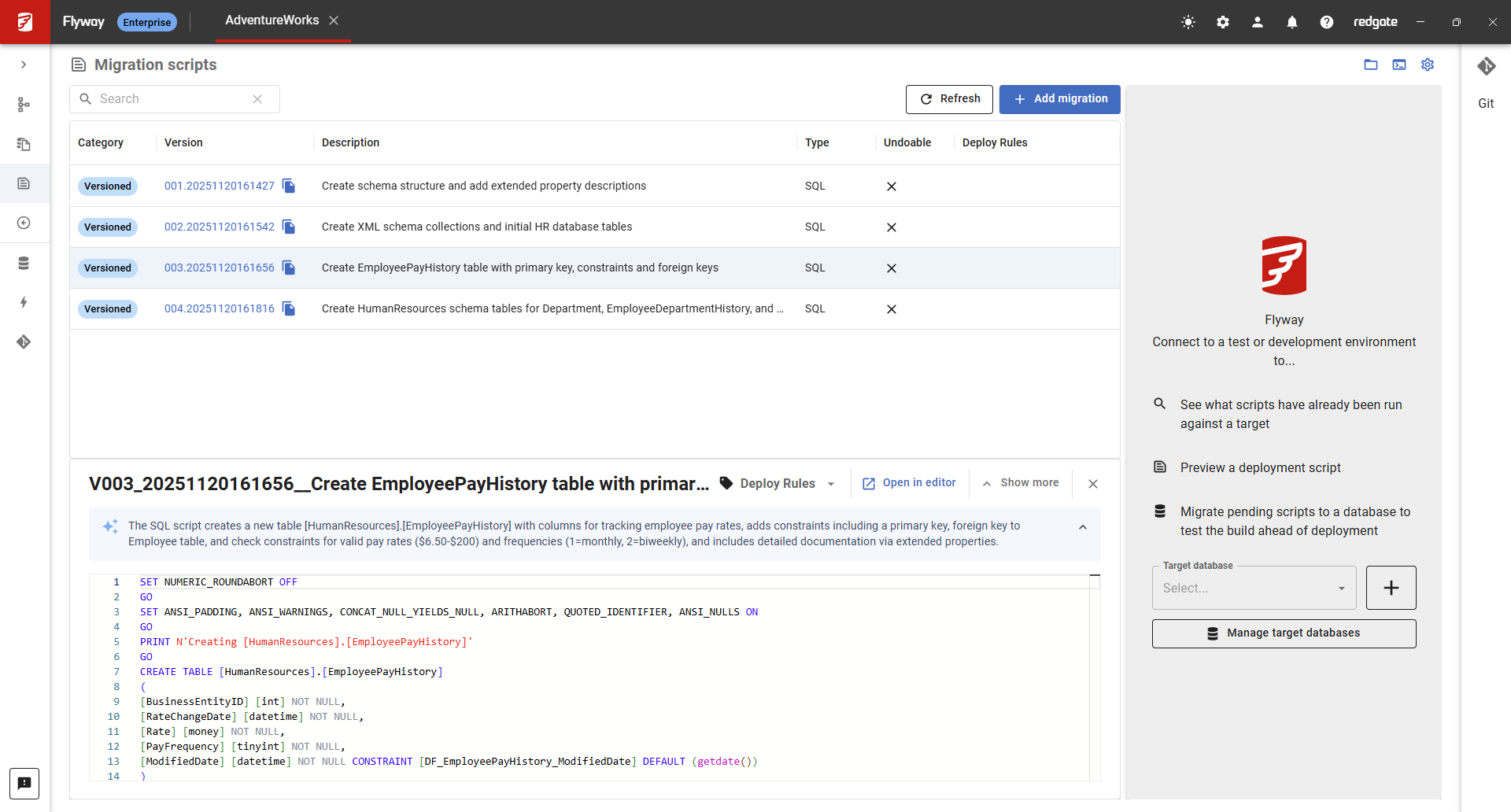 Flyway Enterprise benefits from best-in-class comparison technology that Redgate has been refining since 1999. That knowledge powers object-level history of database changes and auto-generated migration scripts.