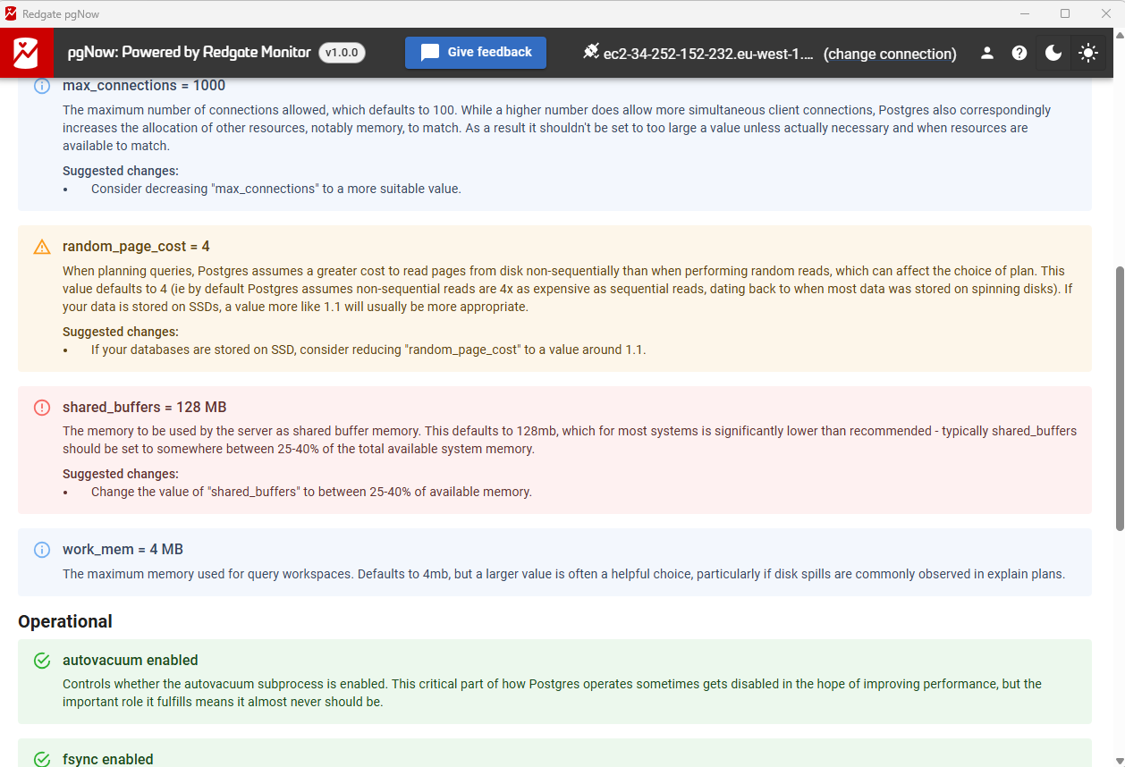Evaluate your PostgreSQL settings against best practices. Get clear, graded recommendations.