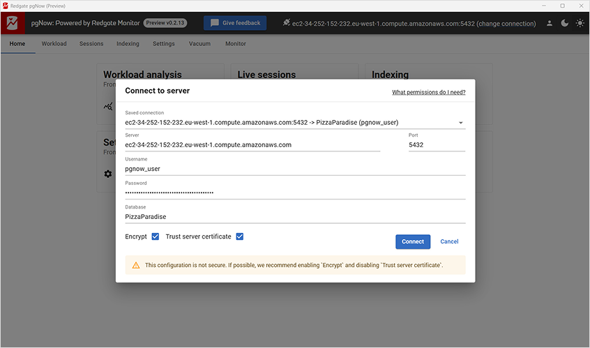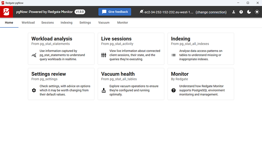 pgNow is a lightweight desktop app that runs on Windows, macOS, and Linux. Just download, connect to your database, and start diagnosing.