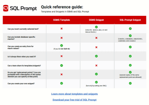 This handy quick reference guide shows you how snippets in SQL Prompt add versatility and flexibility to standard templates and snippets in SQL Server Management Studio.