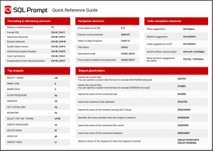 This handy quick reference guide includes our top 12 snippets, and shortcuts and tips for code-completion, formatting, navigation, and refactoring SQL code in SSMS and Visual Studio.