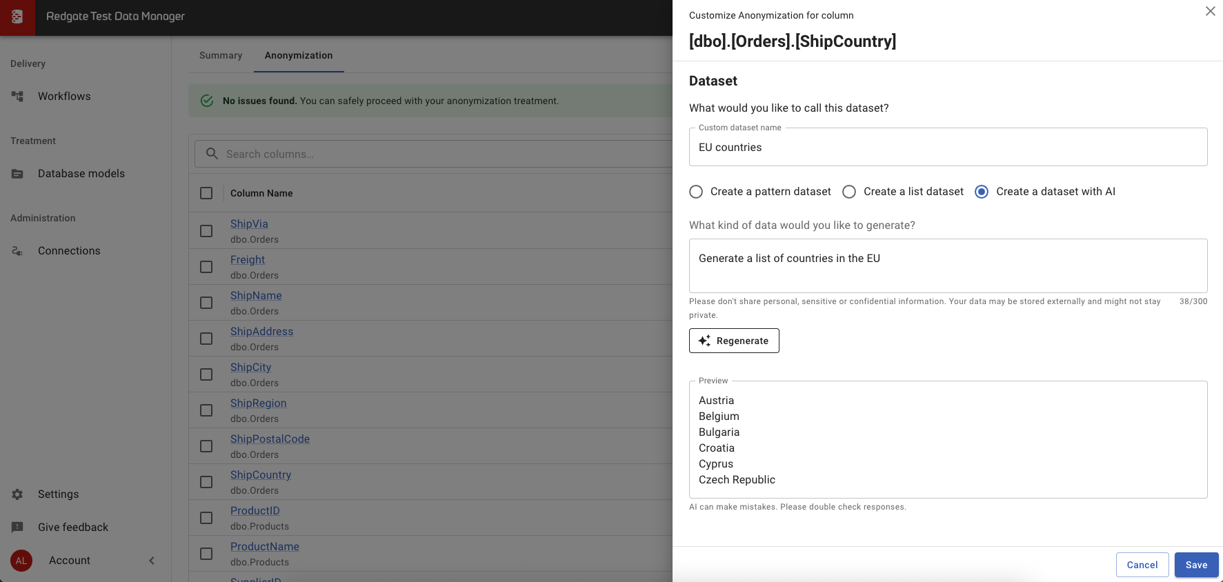 Need Spanish names or German addresses? Just ask, and generate bespoke, fake alternatives in seconds using AI custom datasets.