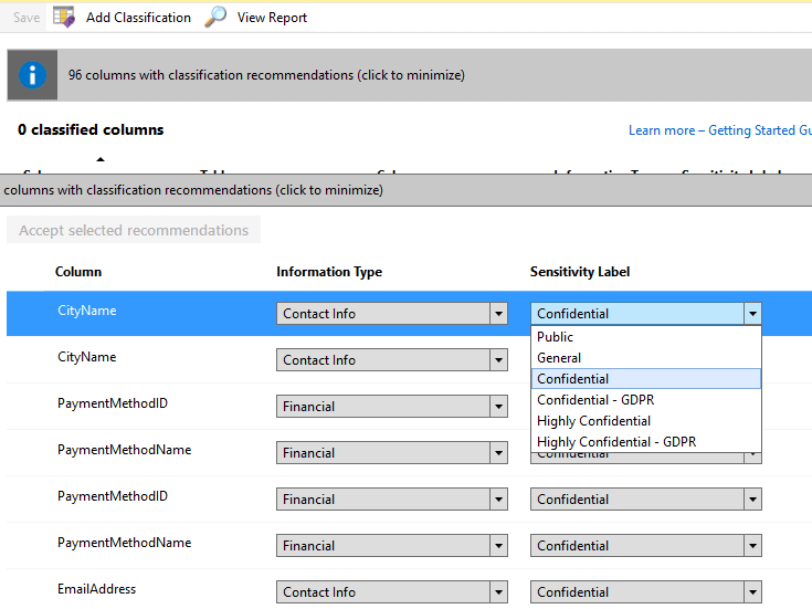 The data discovery and classification feature help us with this. First, it tries to automatically identify which fields are sensitive and recommend a classification for them. We can set classifications for the fields recommended and anyone else.