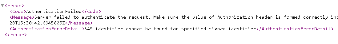The resulting key is different than the usual SAS keys. It doesn’t include the parameters for the expiration date and the user permission. It includes a reference to the policy and it will use the information it has.