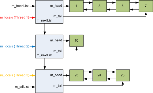 So, although m_locals is defined as thread-local, the m_headList, m_nextList and m_tailList variables aren’t. This means that any thread can access all the thread local lists in the collection by doing a linear search through the outer linked list defined by these variables.