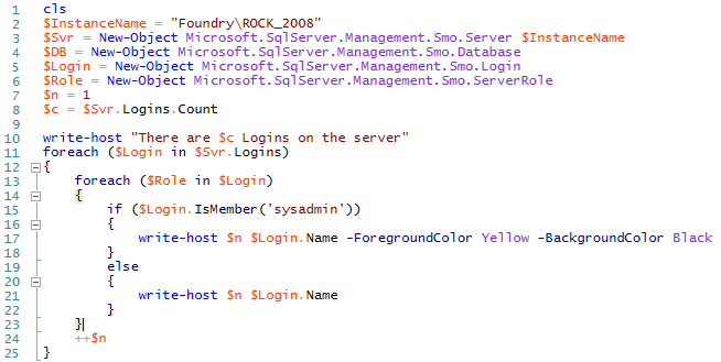 Scenario: I wanted to scan a number of server for many properties, including existing logins and to identify which accounts are bestowed with sysadmin privileges. A great task to pass to PowerShell, so with a heavy heart I started up PowerShellISE and started typing. The script doesn’t come easily to me but I follow the logic of SMO and the properties and methods available with the language so it seemed something I should be able to master.