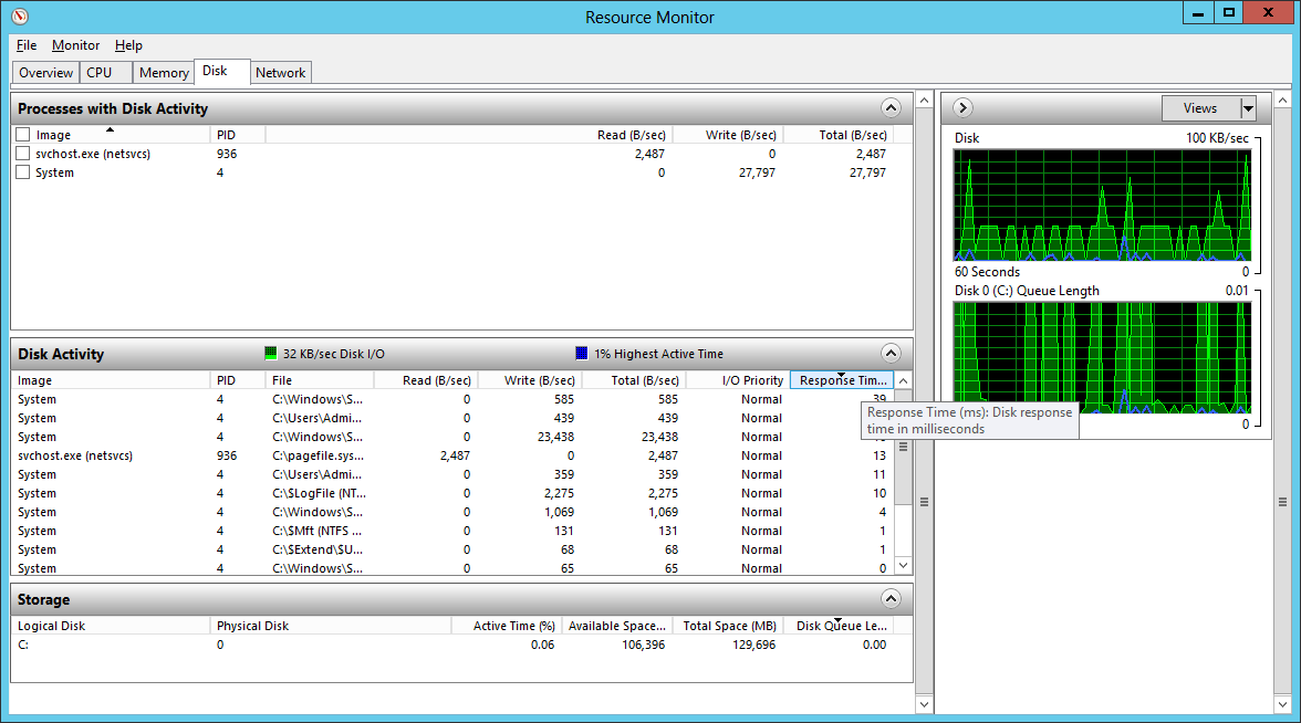I use this tool to start with the Disk and Network components. I can quickly locate which processes are taking the most time on the disk, and start identifying a chain of processes that are affected by opening the Disk tab and sorting the columns by Response time.