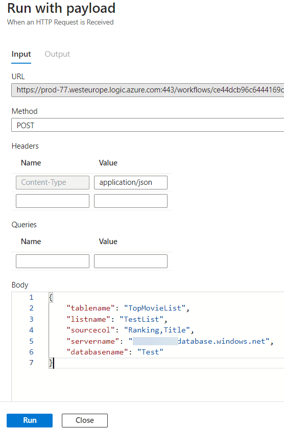The Logic App can now be tested. In the editor, I select “Run with payload”, which allows me to specify a JSON request body for the HTTP trigger.
