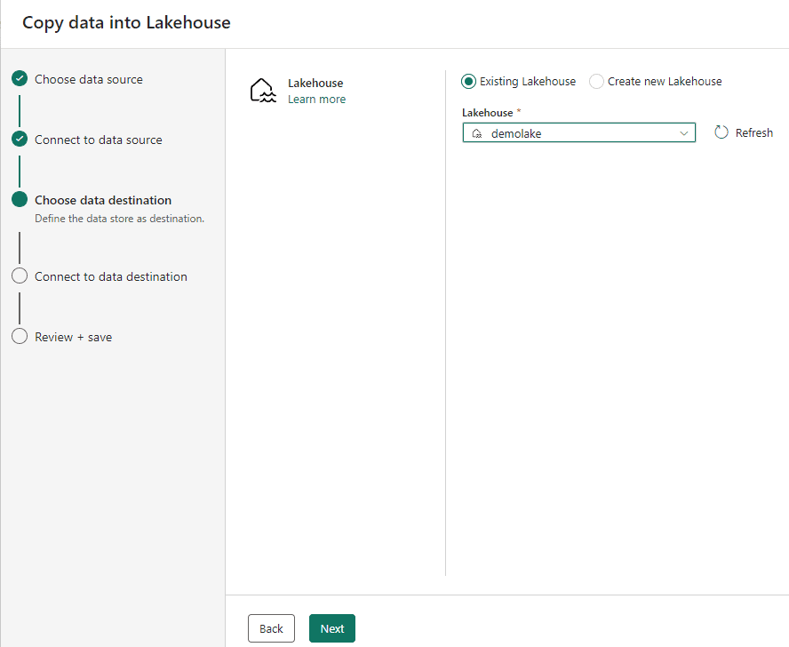 • Choose the option Existing Lakehouse