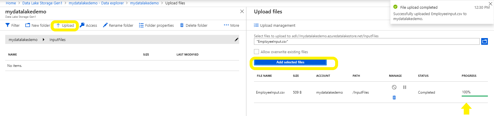 After you navigate to USQLDataRoot folder, create a folder called InputFiles and copy the EmployeeInput.csv file there. It can then be referenced by the U-SQL script.