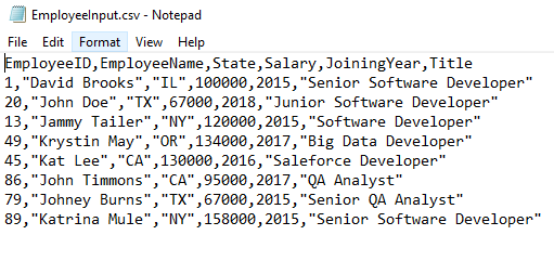 Before moving ahead and getting your hands dirty writing the U-SQL script, first, download the sample csv file. This is how the csv file looks: