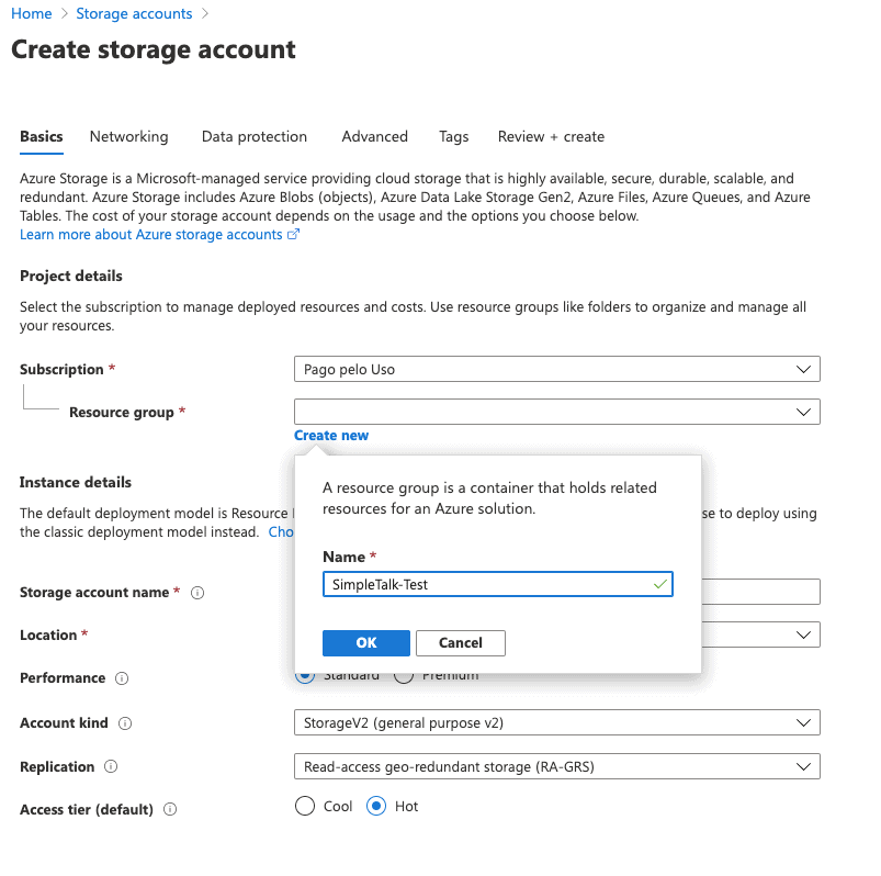 Note that you’ve got to inform a Resource group name. If you don’t have any, click the Create new link and give it a name like shown in Figure 3: