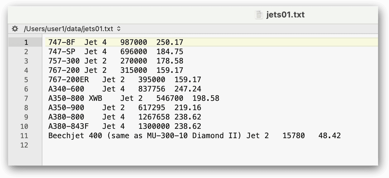 As expected, the file contains only those rows whose engine_type value equals jet. The data is also limited to the five specified columns: plane, engine_type, engine_count, max_weight and plane_length.