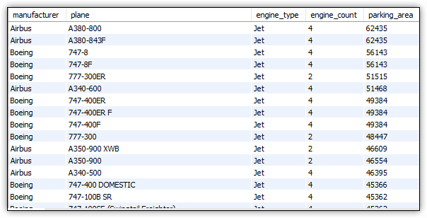 SELECT m.manufacturer, a.plane, a.engine_type, a.engine_count, a.parking_area FROM airplanes a INNER JOIN manufacturers m ON a.manufacturer_id = m.manufacturer_id WHERE a.parking_area > 1000 AND max_weight > 10000 ORDER BY a.parking_area DESC, m.manufacturer, a.plane; |