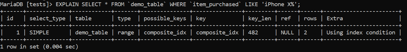 EXPLAIN SELECT * FROM `demo_table` WHERE `item_purchased` LIKE ‘%iPhone X%’; EXPLAIN SELECT * FROM `demo_table` WHERE `item_purchased` = ‘iPhone X’; |