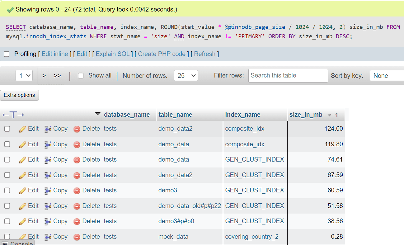 SELECT database_name, table_name, index_name, ROUND(stat_value * @@innodb_page_size / 1024 / 1024, 2) size_in_mb FROM mysql.innodb_index_stats WHERE stat_name = 'size' AND index_name != 'PRIMARY' ORDER BY size_in_mb DESC; |