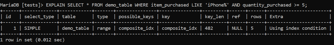 The output of the EXPLAIN query shows that MariaDB elects to use our composite index. Our index has a key length of 482 bytes and that allows us to determine how many parts of our composite index are used by MySQL. This time, it’s a safe bet that MariaDB uses the item_purchased part of the composite_idx and we can confirm it by swapping the column order with a query like so: