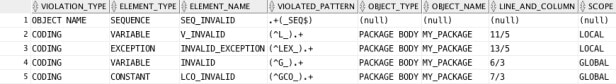 It is even possible to only query for certain object or identifier type naming violations. Take a look at the API_NAMING_CONVENTION package specification for all available functions. The SEQUENCE_NAME_VIOLATIONS function for example only returns improperly named sequences.
