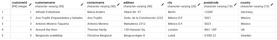 Let’s examine what a few tables look like that we are going to be joining together for an INNER JOIN. First, the customer table looks like by returning a few rows from the table. Using pgAdmin, start a new query in the Northwind database and execute the following query: