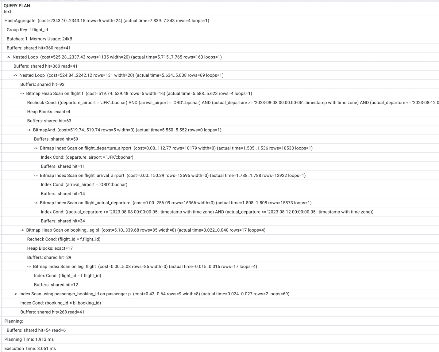 Looking at all the execution plans which were produced during our experiments, we can notice one major deficiency: Postgres has to read the heap (table rows) in order to find records where the actual departure is within the range from August 8 to August 12. That indicates that an index on this attribute might help. Let’s go ahead and create the missing index: