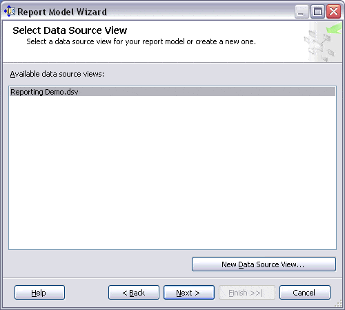 From the menu, select Project -> Add New Item. When the dialog opens, select Report Model Wizard and name it ReportingDemo.smdl. Alternatively, you can right-click on the Report Model folder and select Add New Data Model. Either way, click past the wizard start screen.