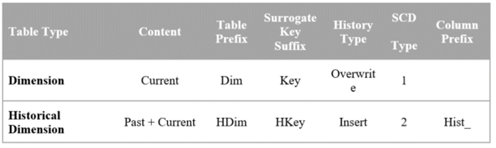 Dimensions are always maintained with overwrite logic, while Historical Dimensions track historical changes through SCD Type 2 inserts. Exactly how this is done is explained shortly.