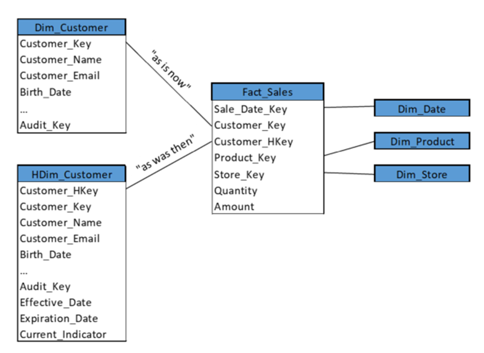 Figure 2: Users decide if they want sales transactions with historical values of the customer (join to HDim_Customer through Customer_HKey) or current values (join to Dim_Customer through Customer_Key).