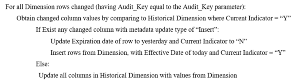 The procedure can read the structure of the Dimension and Historical Dimension tables from the database catalog and execute dynamic SQL to process the changes. The call performs well since the Audit_Key is an indexed value that quickly identifies changed rows. The procedure does not perform a final commit transaction to the data – that is the responsibility of the calling Dimension load. This preserves the Historical Dimension load as part of the all-or-none load of the Dimension.