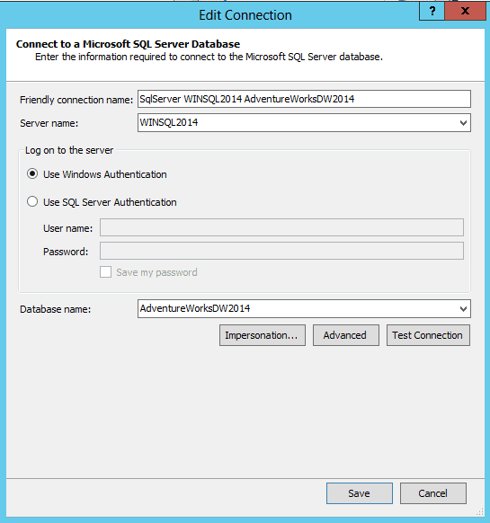- In ‘Existing Connections’ window Select the existing connection (‘SqlServer WIN2SQL014 AdventureWorksDW2014’) and click in ‘Edit’ button