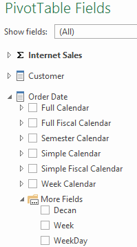 - In ‘Pivot Table Fields’ area, expand ‘Order Date’ dimension and notice the new hierarchy we just created, ‘Week Calendar’