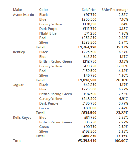 Here is a measure – SalesPercentage – that uses the Allselected() function as the filter for the Calculate() function that returns the percentage total of an element relative to the grand total.
